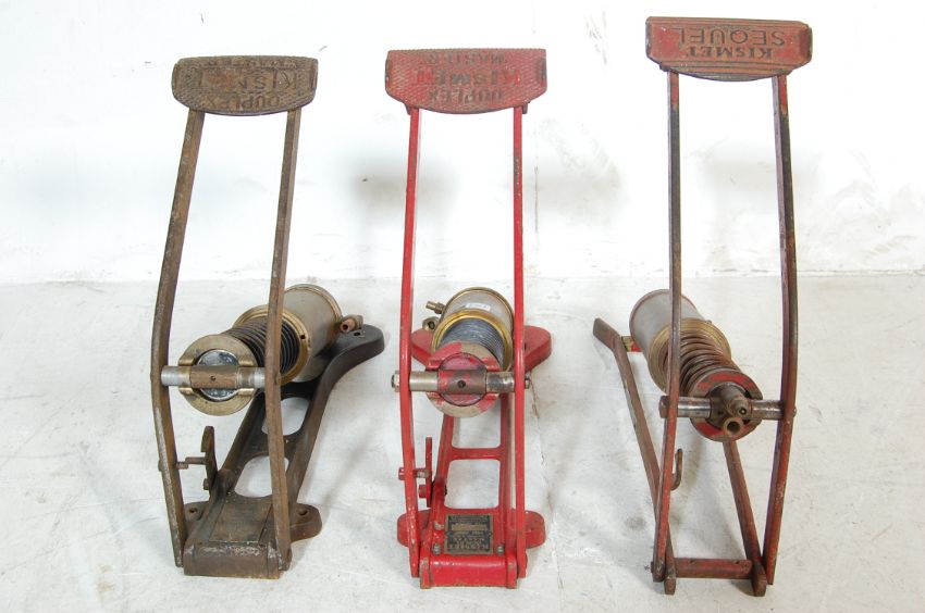 A collection of mid century Industrial foot pumps to include 2 vintage Duplex Kismet Master's and a Kismet Sequel foot pump, all with metal base and shaped pipes. Measures, 13 cm H x 39 cm W x 8 cm D