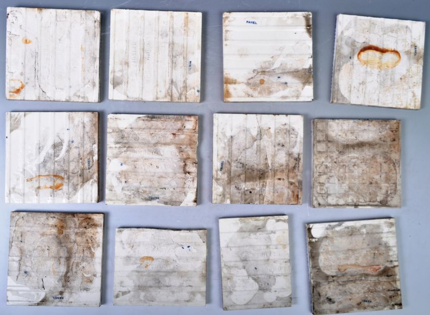A rare set of 12x 19th Century Victorian English antique ceramic wall / floor tiles by Josiah Wedgwood & Sons Etruria each having blue and white decoration central floral medallion and leaves with scroll and geometric borders. Each stamped to verso. Measures: 15cm.