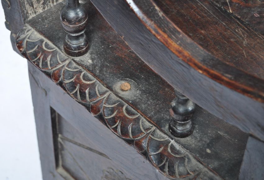 An incredible 16th Century Elizabethan English antique oak panel hall settle bench comprising of an early oak panel intricately carved with beautiful decoration with lion mask and angel faces throughout. Set to an 18th Century made oak coffer settle base with carved detailing and scrolled arm rests. Measures: 117cm x 136cm x 60cm.