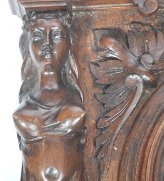A stunning late 18th Century French antique mahogany cased clock barometer. The wall clock having a decorative carved floral and scroll pediment above further carved leaf decoration. Central mahogany dial with applied enameled Roman numeral chapter ring and pierced hands, flanked by carved female figures to each side. Central thermometer above a barometer having a glass front. The case housing a brass movement. Measures 99cm x 52cm 19cm.