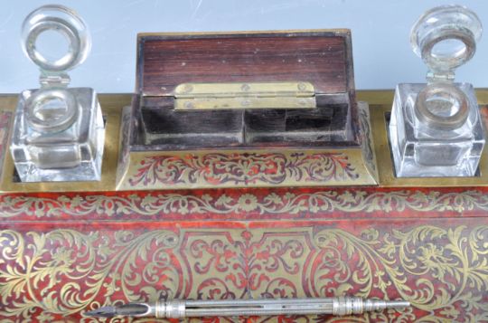A stunning 19th Century antique French boulle work red tortoiseshell decorative desk tidy. The desk stand of rectangular form having a raised back with a central hinged lidded compartment flanked by glass inkwells to each side. Large pen rest to the front with stunning scroll and floral brass inlay throughout all upon an oak base having brass banding raised on on bun feet. Measures 13cm x 35cm x 24cm.