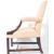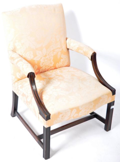 A 19th Century Georgian style English antique Gainsborough armchair / arm chair having pink floral upholstery. The showood frame having carved rail detailing and ebonised finish. All raised on block legs with 'H' stretcher. Measures: 91cm x 63cm x 67cm.