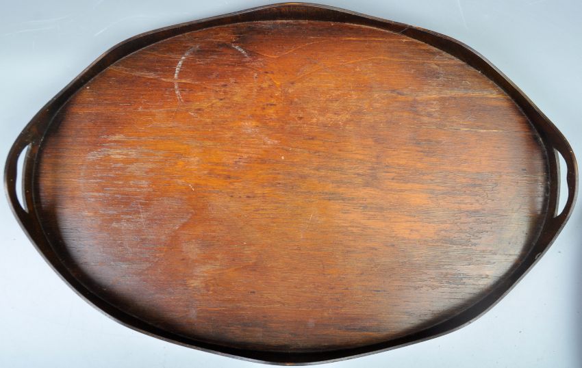 Two early 19th Century Georgian English antique oak / mahogany serving trays of coopered form one having raised scalloped gallery sides with twin carry handles and the other with a raised edge . Twin brass bounds surrounding the sides. Measures: 50cm x 34cm.