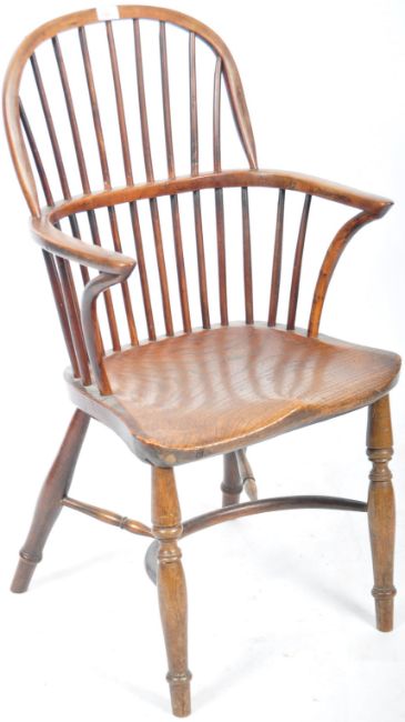 A late 18th Century Georgian English antique yew and elm wood windsor chair armchair having a yew wood spindle come back, shaped elbow rests and panel seat all raised on turned and tapered legs united by a crinoline stretcher. Measures: 93cm x 54cm x 46cm.