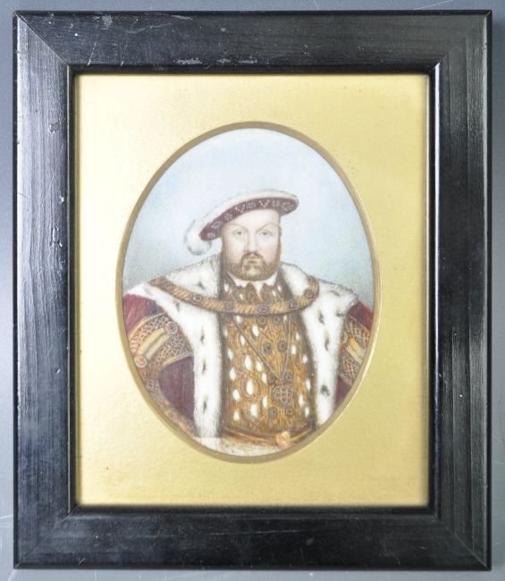 Follower of Hans Holbien The Younger - A watercolour on ivory portrait miniature painting depicting Tudor King Henry VIII Of England. The half figure portrait set in his iconic coat and hat set to a blue painted ground. The watercolour painting set to a gilt slip within an ebonised frame. Complete with hanging loop to verso. Portrait measures: 10cm x7.5cm. Frame measures: 16cm x 14cm.