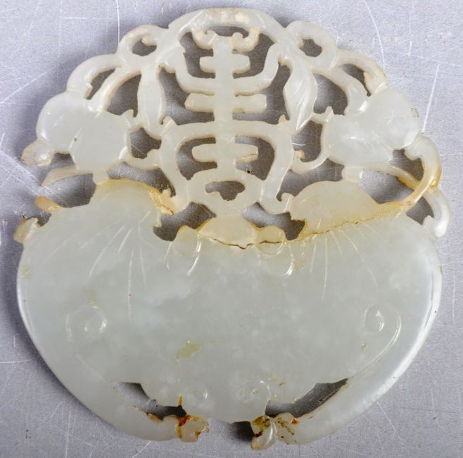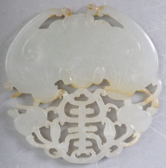 A 19th Century Chinese antique hand carved jade panel depicting a bat and peaches with pierced detailing and character mark. Measures: 5.5cm wide.