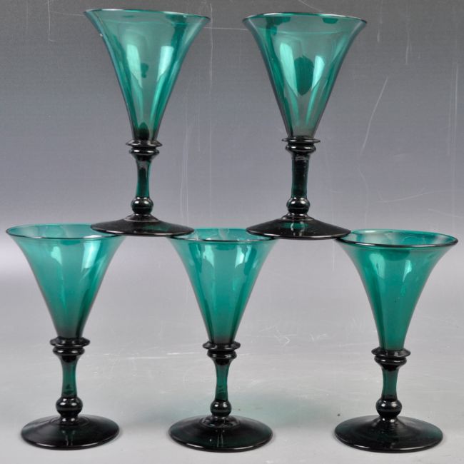 A rare set of five 18th Century Georgian English antique Bristol Green glass drinking glasses having trumpet bowls, bladed and baluster stem raised on a slight dome circular foot. Great colour to these drinking glasses. Measures: 13cm tall