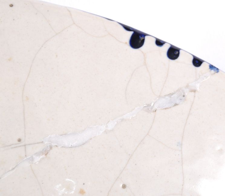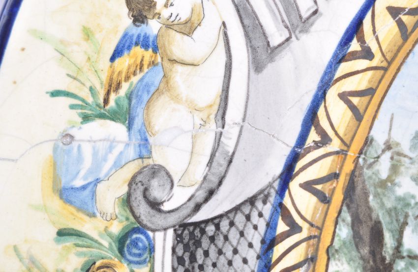 A large and impressive 19th Century Italian majolica tin glazed earthenware charger of circular form having hand painted scenes depicting classical figures with cow, dog and cherubs. The borders decorated with face masks, cherubs and scrolls. Signed in blue to reverse. Measures: 62cm wide. Has been restored