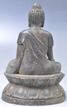 An 18th Century Chinese antique bronze statue of Buddha with bead headdress seated in the Lotus position with one hand on knee raised on double lotus pedestal base. Measures: 12cm tall.