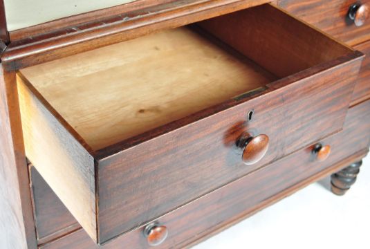An early 19th Century Georgian English antique mahogany country house linen press wardrobe / housekeepers cupboard of impressive size having a twin flame mahogany door cupboards opening to reveal a fully appointed interior with multiple linen slides and brass hanging rail. All raised on a two over three chest of drawer base on turned legs. Dismantles into three pieces of ease of transport. Measures: 211cm x 133cm x 66cm.