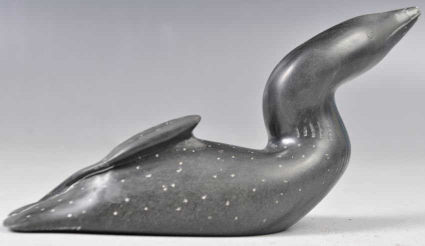 Jimmy Iqaluq (b1947) E9-159 - Black Loon - A superb 20th Century Inuit Art hand carved soapstone sculpture figurine of a black loon bird with head and beak raised, wings tucked and crossed finished with speckled decoration. Signed by artist to underside and dated 1990. Label present reading carving nuner 5115. Measures: 16cm long from tip of beak to end of tail feathers. Jimmy was born in Kataapik, near Sanikiluaq, on the Belcher Islands, in 1947. He has been carving since he was 13 years old. He learned carving by watching his parents, Mina and Samwillie. His work is characterized by intricate details developed through both carving and incising techniques. His experience and knowledge as a hunter is reflected in his carvings. The Loon Bird is a example of one his most famous pieces. Currently, he enjoys providing country food for this family and friends.