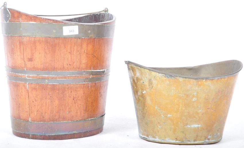 An 18th Century Georgian English antique oak and brass bound coal bucket / peat bucket of nivette form having brass coopered barrel type bands, swing handle atop and inset brass bucket. A great period example. Measures: 34cm tall (without handle)