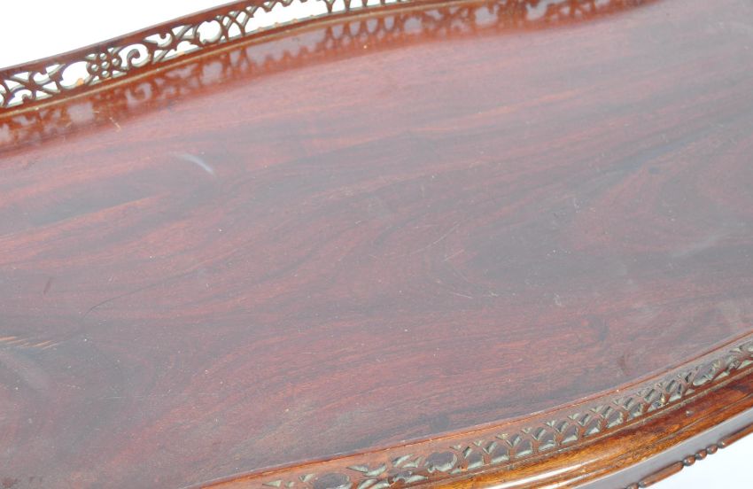 A 20th Century Chinese Chippendale Revival mahogany silver table in the 18th Century Georgian George II manner having an intricate pierced gallery Gothic frieze with removable tray top over stunning carved 'X' frame base raised on tapering legs with spade feet. An impressive example. Measures: 72cm x 86cm x 48cm.