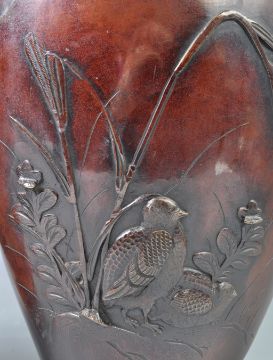 A pair of 19th Century Japanese Meiji period antique bronze twin handled vases having bamboo effect loop handles with panels to the rim. The bodies decorated in relief with scenes of birds and leaves. Measures: 41cm tall.