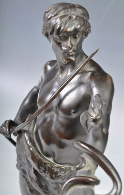 Eugene Marioton (1854-1933) - Fascinator - A 19th Century French antique bronze statue figurine of a snake charmer. The male figure with snake entwined around arm and raised on a square naturalistic base. Titled to front with stamped foundry mark to reverse. An impressive example. Measures: 32cm tall.