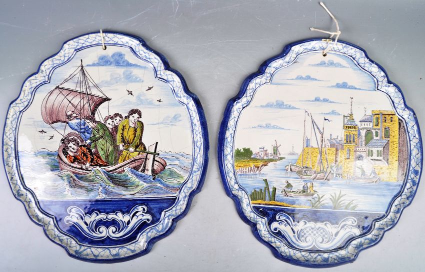 A pair of 19th Century Dutch antique Delft tin glazed earthenware wall hanging plaques depicting vibrant scenes. One depicts a river scene with windmills, buildings, boats and figures. The other six figures and a masted ship sailing on a calm sea. Both of scalloped form. Measures: 37cm x 33cm.