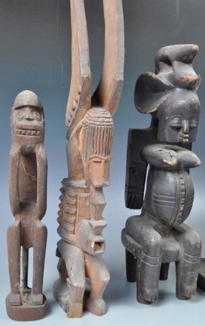 A collection of nine 20th Century African Tribal antique hand carved wooden figurines comprising: hunched figurine on wooden base, seated figure with halo, soldier on bicycle, pair of seated smiling figures, breastfeeding figurine group, figure seated on rock, seated pregnant figurine and another unusual example. Great collection. Tallest measures: 49cm.