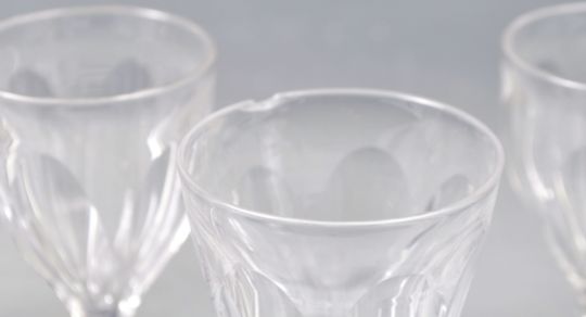 A set of ten 19th Century Victorian English antique hand blown wine or port glasses comprising of bell shaped bowls with panel cut decoration raised on faceted stems over circular bases. Measures: 11cm x 6cm.