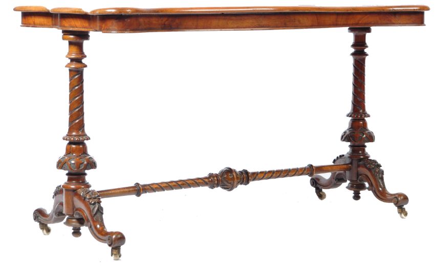 A 19th Century Victorian English antique walnut stretcher table writing table desk having a double serpentine top raised on a twist carved bulbous supports united by matching stretcher on ceramic castors. Measures: 69cm x 120cm x 59cm.