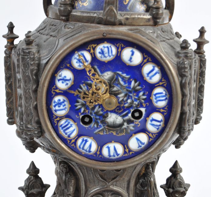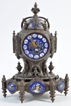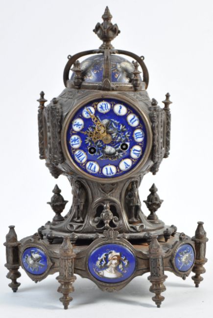 Leroy Et Fils of Paris - A 19th Century French antique mantel clock having a bronze / brass case with inset painted blue ceramic panels depicting classical knights with Roman numeral chapter ring and crown top. Measures: 34cm tall.