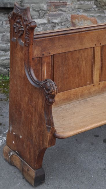 A stunning 19th Century Victorian English antique oak ecclesiastical church cathedral pew bench having a square panel back with single plank seat. The sides hand carved depicting acanthus leaves, grape and vine and floral motifs. Bible shelf to reverse with brass nameplates. Impressive period example. Measures: 113cm x 299cm x 53cm.