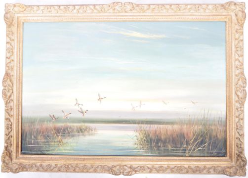 Thomas Kennedy - English Artist - A good 20th Century oil on canvas painting entitled 'Evening On The Marshes' depicting an evening sunset over marshlands with mallards taking flight. Signed by the artists to the bottom left. Named to the veros and being set within a rustic gilt frame. Overall size measures 75cm x 108cm.