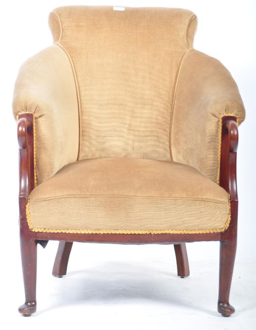 A 19th Century English antique mahogany library reading armchair chair in the George I manner having a tub shaped seat with broad backrest and cushioned elbow rests with ' Shepherd Crook ' arms. All raised on a tapering pad foot. Measures: 94cm x 63cm x 67cm.