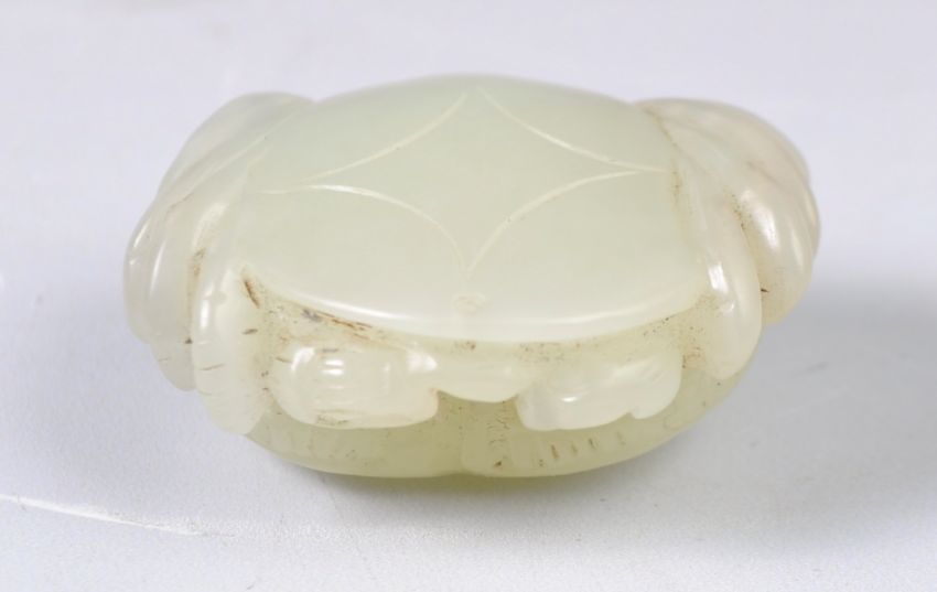 A 19th Century Chinese antique hand carved jade figural pendant in the form of a crab resting on a coin with lightly carved detailing. Measures: 3.5cm wide.