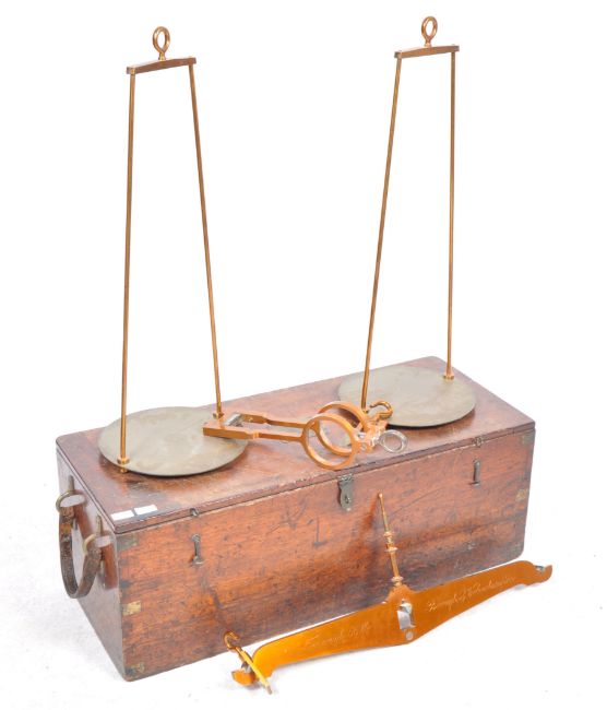 An impressive set of 19th Century Victorian cased ' Standard Scale ' Avery hanging brass balance scales to weigh 56lbs. Originally made for the Borough of Wolverhampton and likely the Dept of Weights & measures duty section. The beam scale also stamped for Borough of Wolverhampton. Cased within a large mahogany case with leather strap carry handles to side and plaque with notation to the top  marked for the Borough of Wolverhampton. Measures 36cm x 98cm x 41cm.