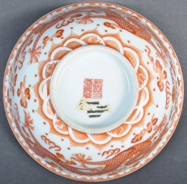 An 18th / 19th Century Chinese antique Jiaqing (1796-1820) mark and period porcelain bowl of remarkable quality having hand painted ocher iron red depicting two dragons chasing the flaming pearl. Six character seal mark to underside of small foot with remains of a museum / collection label. Measures: 15cm x 8cm. Condition: No visible damage.
