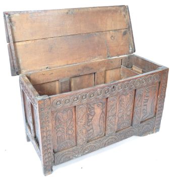 A rare 17th Century Scottish Jacobean antique joined panelled oak coffer chest blanket box. Highly decorated and carved with scenes of rampant lions and thistle. The hinged lid opening to reveal a spacious interior with wrought iron ring hinges and lock. Raised on stile legs. An impressive early example. Measures: 72cm x 129cm x 53cm.