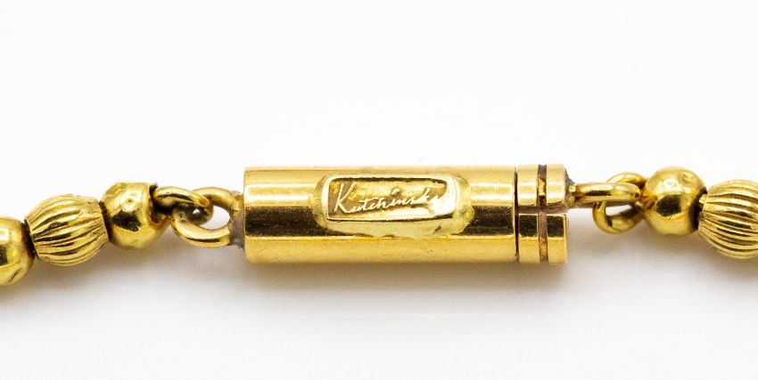 A hallmarked Kutchinsky 18ct gold and diamond pendant necklace. The necklace strung with hollow fluted and polished gold beads over a gold chain with a pendant of geometric form (perhaps representing a fish or scales) set with marquise and round brilliant cut diamonds (estimated VS, E -G). Principal marquise diamond estimated 0.33ct. Signed Kutchinsky to clasp and pendant. Assay mark to jump rings and 750 KLd to tongue of barrel clasp. Hallmark for London 1987. Estimated total diamond weight 3ct. Measures 16 inches, pendant 3.25cm x 2.25cm. Weight 16.07g.