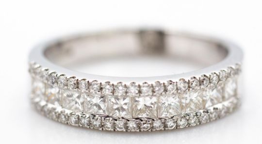 An 18ct white gold and diamond half eternity ring. The ring with central emerald cushion cut diamonds within channels of round cut diamonds. Total weight 4.30g / Size N.5