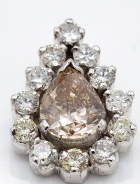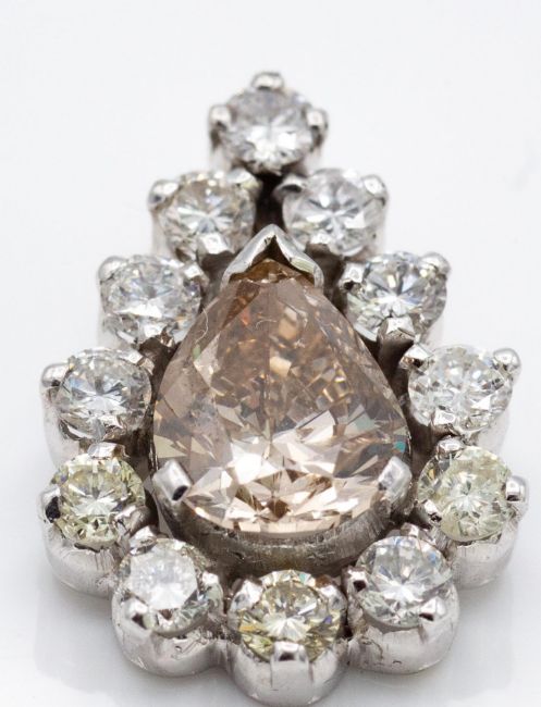 A hallmarked 18ct gold and diamond cluster pendant. The pendant set with a central pair cut diamond - orangish brown - champagne diamond  estimated carat weight 1.85ct. framed by 12 round brilliant cut diamonds estimated total weight 1.32ct. Measures length 1.95 cm – width 1.4cm.  Hallmarked London. Total weight 3.25g.  Total estimated carat weight 3.12ct.