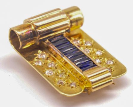 An Art Deco 18ct gold French sapphire and diamond dress clip. The clip set with french cut sapphire flanked by old cut diamond set stars surmounted by ribbed scroll, twin pins verso. French assay marks to pin Eagle mark and sponsor. Measures approx 2.7cm x 2cm. Weight 12.38g.