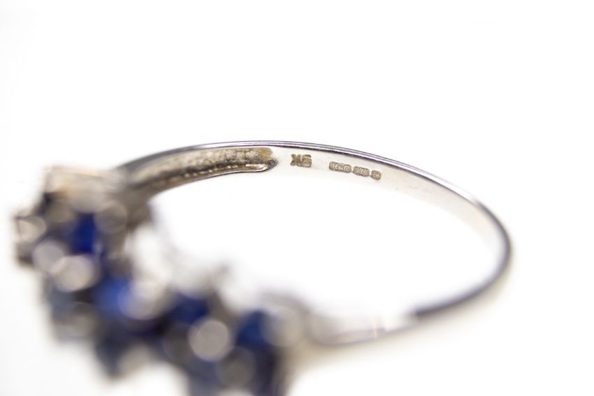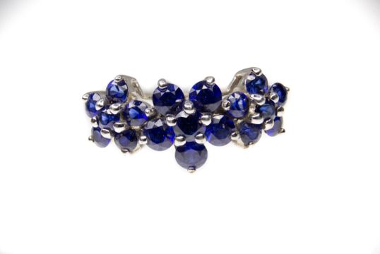 A hallmarked 9ct white gold & Ceylon sapphire cluster ring. The ring having three graduating clusters of round cut Ceylon blue sapphire. Weight 2.21g. Size O.