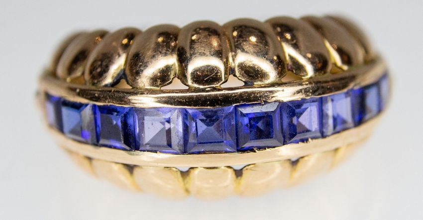 A French 14ct gold and sapphire dome ring. The ring set with a central panel of square cut sapphires in a domed petal setting to ribbed tapering shank. Total weight 8.8g / Size M