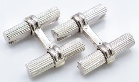 A pair of 18ct white gold Boucheron baton cufflinks. The cufflinks formed with ribbed batons united by stylised polished stirrup bar. French assay marks to terminals signed Boucheron 750 OR AO84D562 to bar. Measures 2.01cm. Weight 15.69g.
