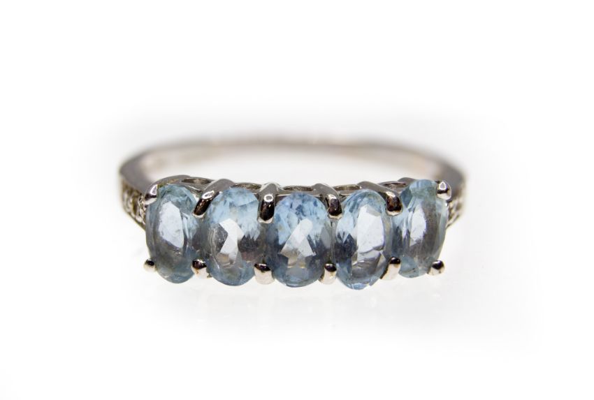 A hallmarked 9ct white gold and aquamarine and diamond five stone  ring. The ring set with 5 oval cut aquamarine approx 5mm x 3mm flanked by 6 diamonds. Weight 2.15g. Size O.