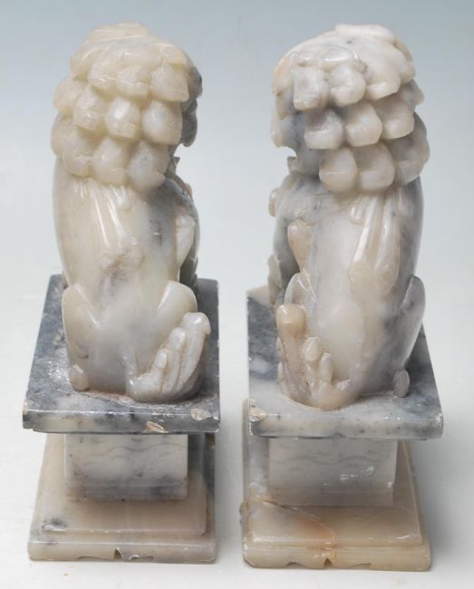 An early 20th century Chinese oriental wooden box. The box having mother of pearl oriental garden scene decoration to the ebonised body along with a pair of soapstone Chinese oriental Fu / foo lion dogs raised on a plinth base. Measures 10 cm high x 20 cm wide x 18 cm deep.