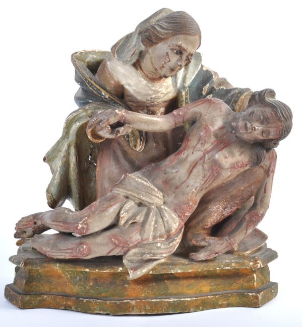 A rare 17th Century Italian antique hand carved religious ecclesiastical figurine group depicting the Pieta with Mary The Mother Of God holding Jesus Christ after the Crucifiction. Hand painted polychrome detailing. Measures: 27cm x 24cm x 13cm.