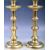 A pair of 19th Century Gothic revival antique polished brass table candlesticks having a large drip tray with cylindrical column decorated with three twin bladed knops. All raised on domed circular bases. Great period examples. Measures: 28cm high.