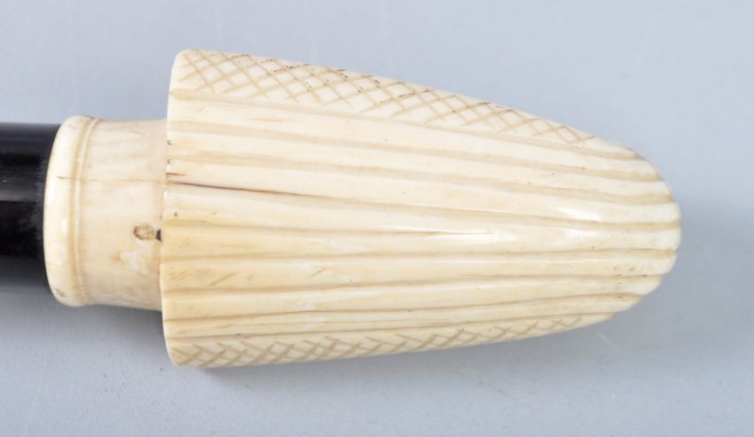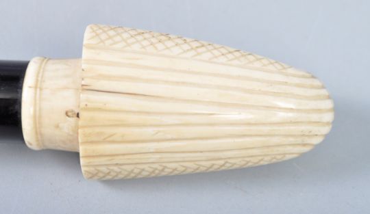 An early 20th Century English antique promenade swagger stick having a carved ivory pharaoh bust atop the ebonised tapering shaft with an ivory ferrule. Good example. Measures 61cm long.