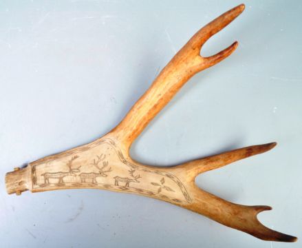 An early 20th Century Inuit art Northern Canadian Reindeer antler scrimshaw hand carved section depicting three reindeer walking in a line towards a star surrounded by carved detailing. Measures: 27cm x 21cm.