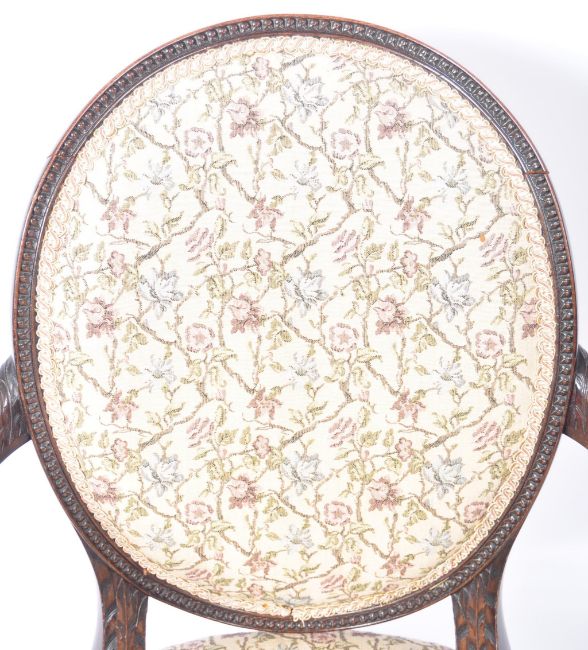 An incredible 18th Century Georgian George III English antique mahogany armchair / arm chair in the manner of George Hepplewhite having cushioned elbow rests with floral upholstered seat and backrest and gadrooned decorated frieze to the seat. Raised on reeded legs. Measures: 93cm x 57cm x 51cm.