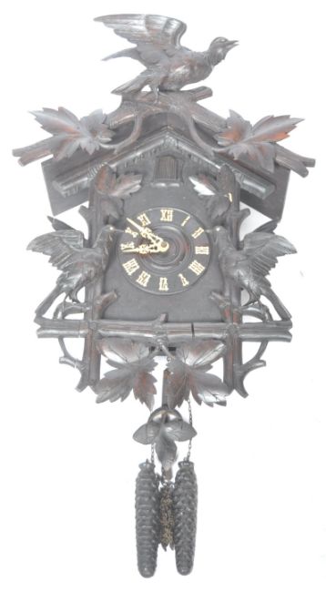 A superb 19th Century Victorian English antique Black Forest cuckoo clock. The wall hanging clock surmounted by a crow above carved leaf and bird design below surrounding an applied Roman Numeral chapter ring. Set with a brass chain driven movement and with accompanying weights and pendulum. Measures 62cm x 51cm x 23cm.