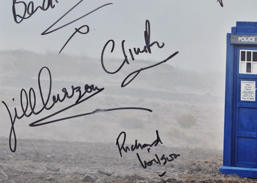 Doctor Who - An impressive multi-signed autographed 12x14" colour photograph from the series, signed by x12 stars who appeared in the series. Autographed by; Simon Fisher Becker, Annette Badland, Jill Curson, Tony Osoba, Daniel Peacock, Peter Purves, Clive Rowe, John Leeson, Christopher Strauli, Matthew Waterhouse, Richard Wilson and another. Each signed in black ink. All obtained in person by the vendor.