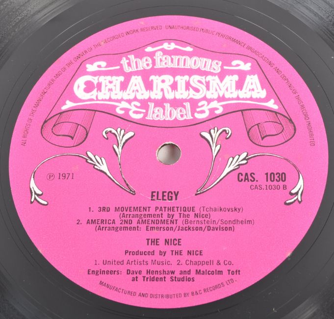 The Nice - Elegy - Released 1971 Pink Scroll Charisma Label - A vinyl long play LP record album UK stereo release CAS. 1030. Matrix number endings A-1U / B-1U. Record condition VG. Gatefold sleeve condition VG.