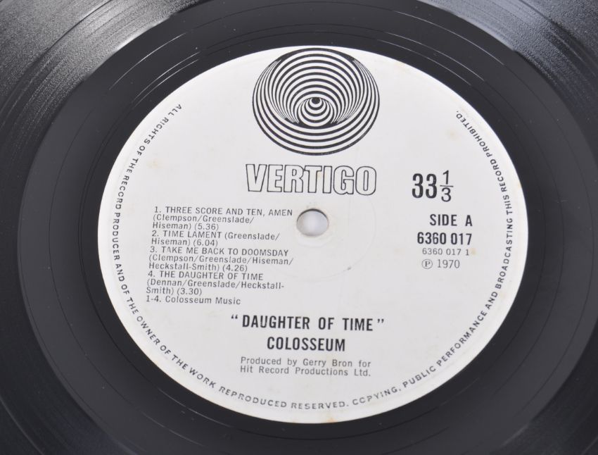 Colosseum - " Daughter Of Time " - Released 1970 Vertigo Label - A vinyl long play LP record album UK stereo release 6360 017. Matrix numbers 1Y// 1 v 420 / 2Y// 1 v 420. With original Vertigo Swirl inner sleeve. Record condition VG+. Sleeve condition G (slight rip to top).