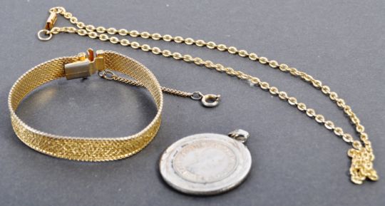 From the Estate of Peter Wyngarde - two items of costume jewellery , owned and worn by Peter Wyngarde throughout his career. The first being a simple gold plated bracelet of typical 1970s form, the other item being a necklace featuring a 1964 Half Penny coin pendant. Likely worn in one of Wyngarde's many TV / Film / Theatre appearances.
